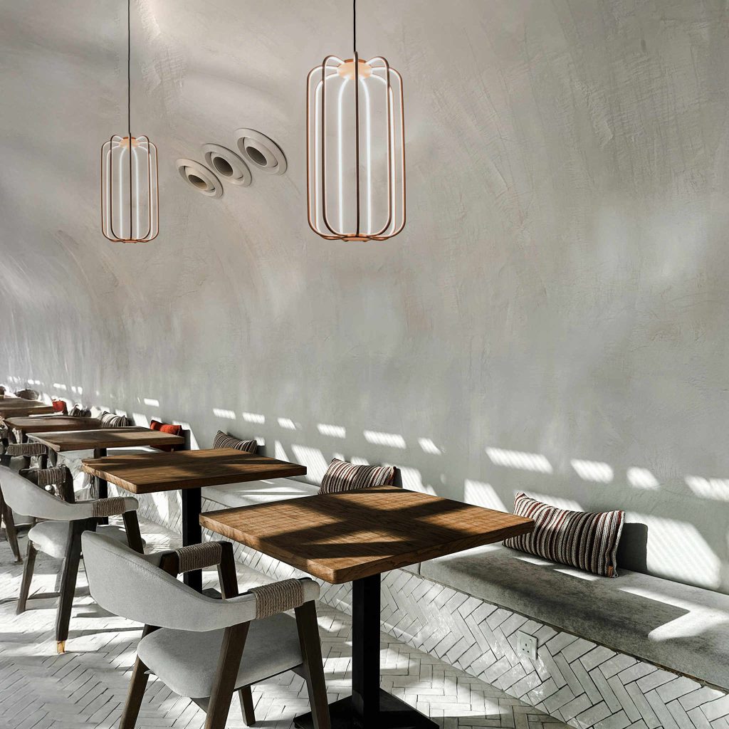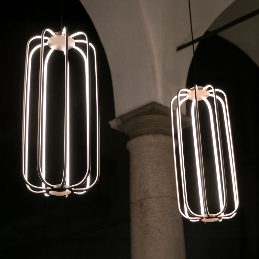 Suspension lamps providing diffuse and indirect light characterised by a structure made of slender calendered aluminium profiles, opal polycarbonate diffuser, LED circuit with CRI>90 and ceiling rose with integrated driver.